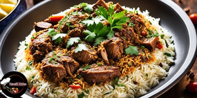 - يُغطى الطبق بإحكام ويوضع في الفرن لمدة ساعتين تقريبًا حتى ينضج اللحم ويصبح طريًا ويتشرب الأرز نكهة اللحم.